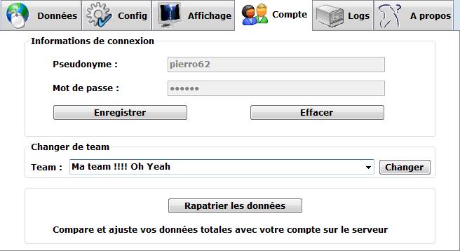 C'est ici que vous définissez les paramètres de votre compte, à savoir votre login et votre mot de passe. Ces paramètres sont indispensable pour vous identifier lorsque vous envoyez vos données au serveur. Vous devez donc avoir un compte sur le site pour avoir votre login et votre mot de passe.
